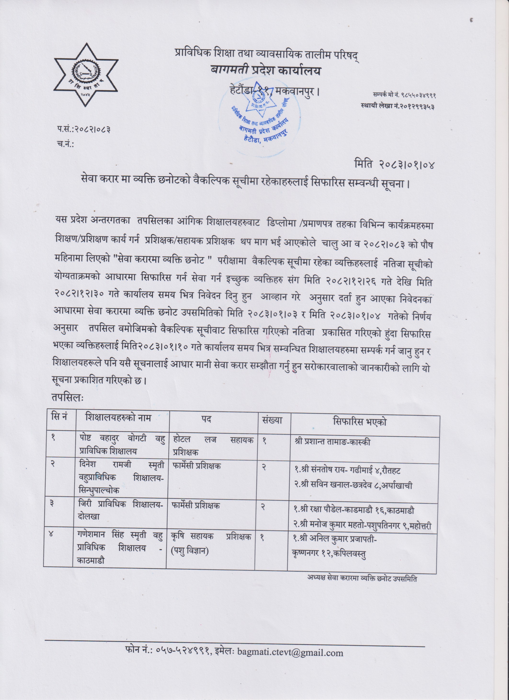 Bagmati Pradesh-सेवा करारको बैकल्पिक सूचीमा सिफारिस सम्बन्धि सूचना